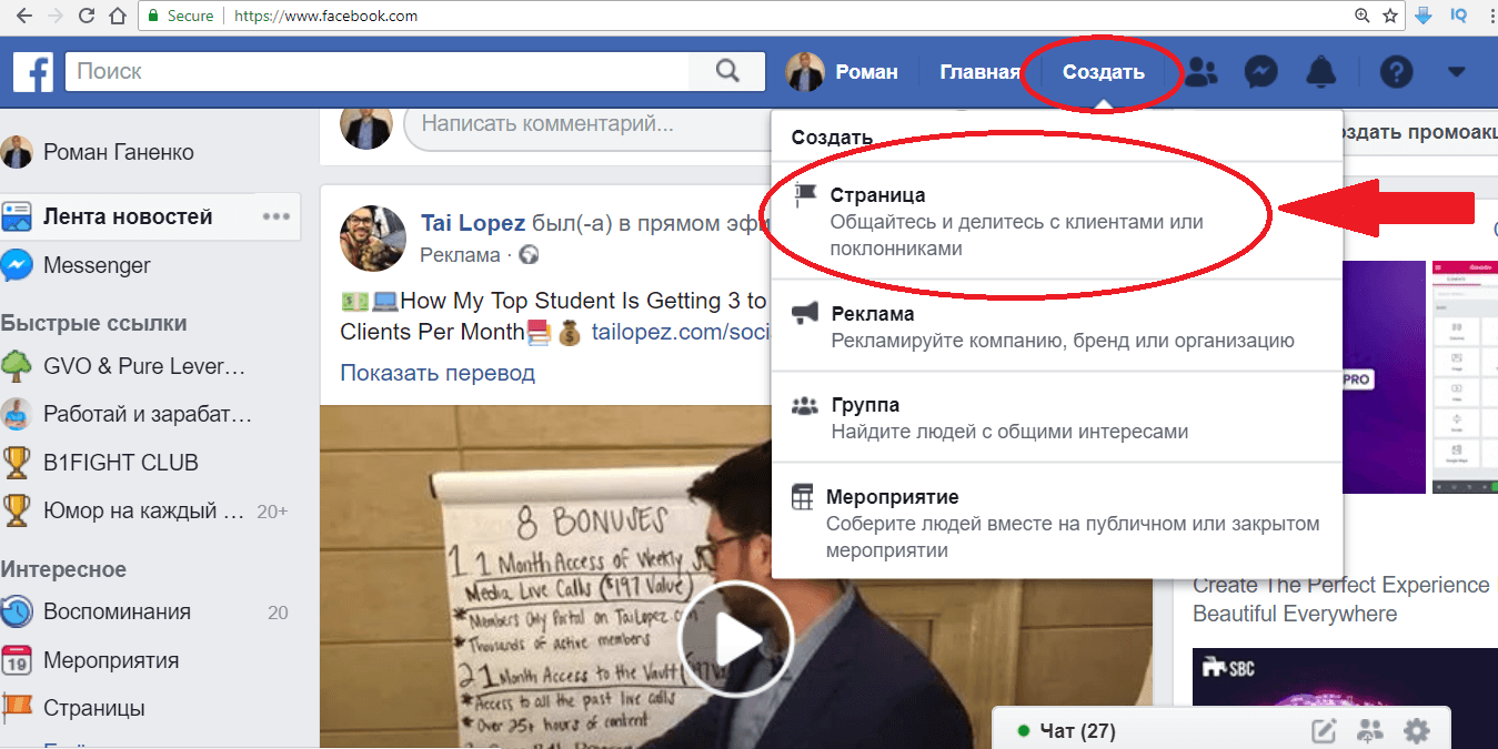 Если его нет, шагом 1 становится регистрация. Понадобится адрес электронной почты либо номер мобильного телефона. Создание аккаунта занимает несколько минут. Дальше нажимаем на значок в виде треугольника в верхней панели профиля, затем — «Создать страницу».