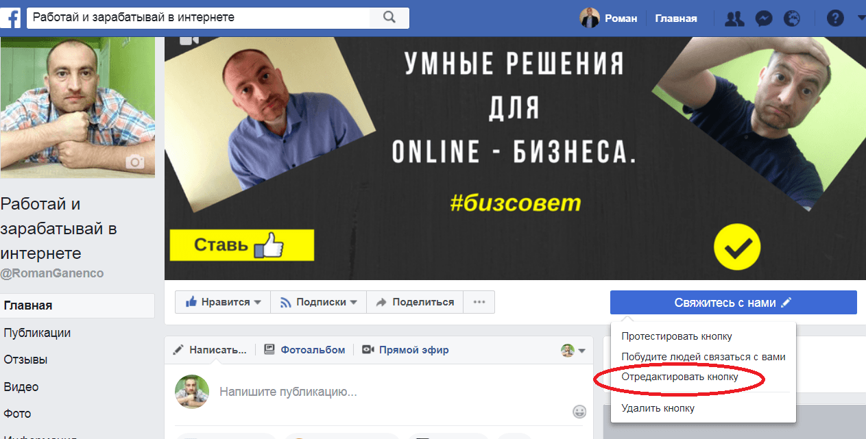 Под фотографией обложки находится меню «Добавить кнопку». Выбирайте подходящий вам вариант. К примеру, «Связаться». Затем нажмите «Протестировать кнопку» и проверьте, как она работает. Если вы решите изменить призыв к действию, в этом же меню есть пункт «Отредактировать кнопку».