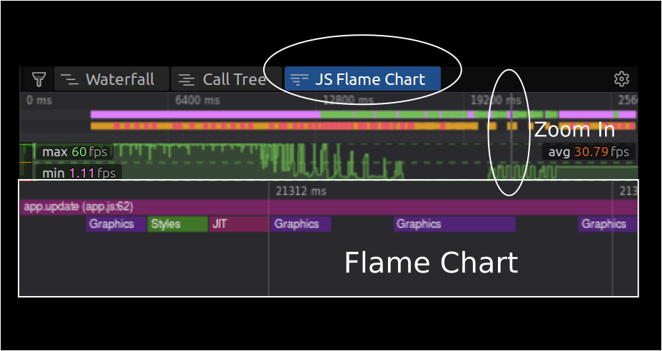 Можно применять эту диаграмму для быстрого обнаружения визуальных пробелов (коллапсов) и несоответствий, которые обозначают серьезные падения частоты кадров. Что является доказательством наличия у браузера проблем с производительностью.
