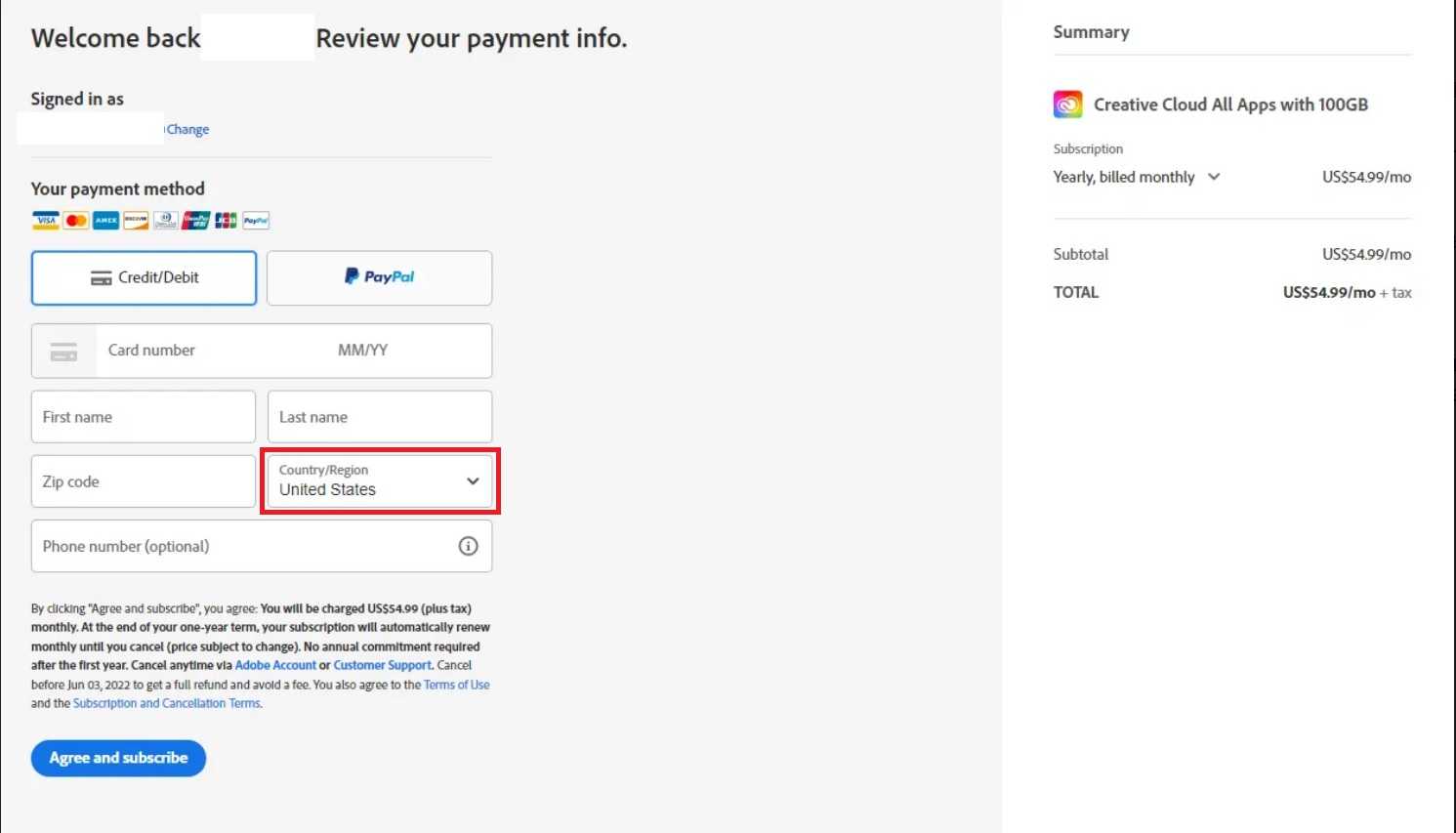 На данном этапе у многих юзеров возникают сбои. Чтобы обойти их, достаточно несколько раз сменить регион уже в окне оплаты. Нужная графа выделена красным на приведенном скриншоте: