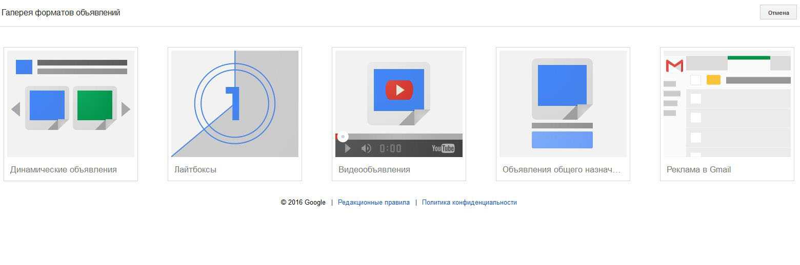 Выбрав пункт «Галерея форматов объявлений» вы сможете создать объявления других типов: