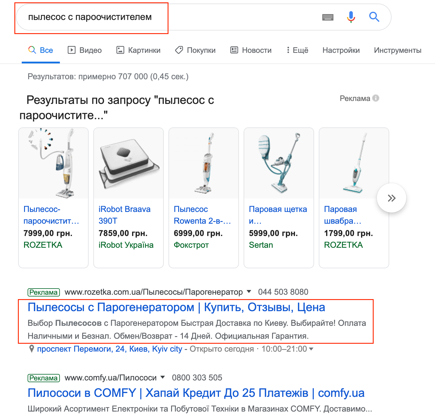 На примере выше пользователь вписал запрос о чистке собачьих зубов, он видит рекламу, и вероятность, что он купит какой-то товар для своего питомца достаточно высока.