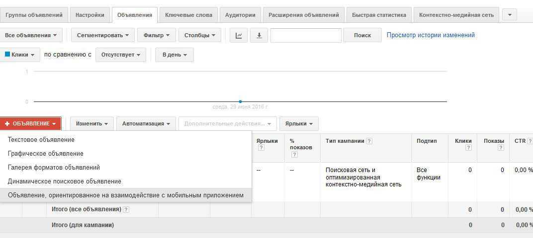 В этом интерфейсе есть возможность создавать любые другие типы объявлений, попробуем создать графическое. Учитывайте, что для медийных объявлений (куда относятся и графические), нужно создавать отдельную кампанию. Просто потому, что специфика у объявлений разная, настройки для текстовых объявлений не всегда подойдут для медийных.