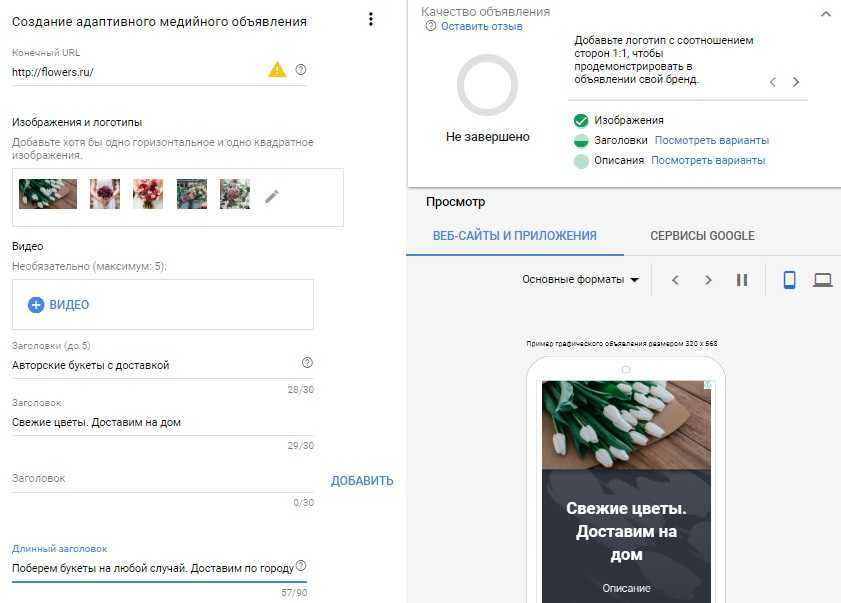 - Загружайте изображения для всех размеров. В таком случае велика вероятность, что система создаст эффективное объявление для любого места размещения.