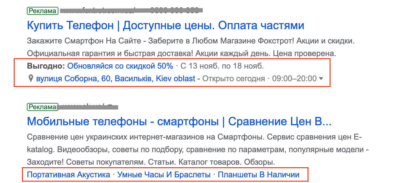 Функционал Adwords позволяет настроить расширенные объявления. Например, адрес и рейтинг магазина, номер телефона или ссылки на различные разделы сайта. Список расширений больше, чем аналогичные настройки в Яндекс.Директе.