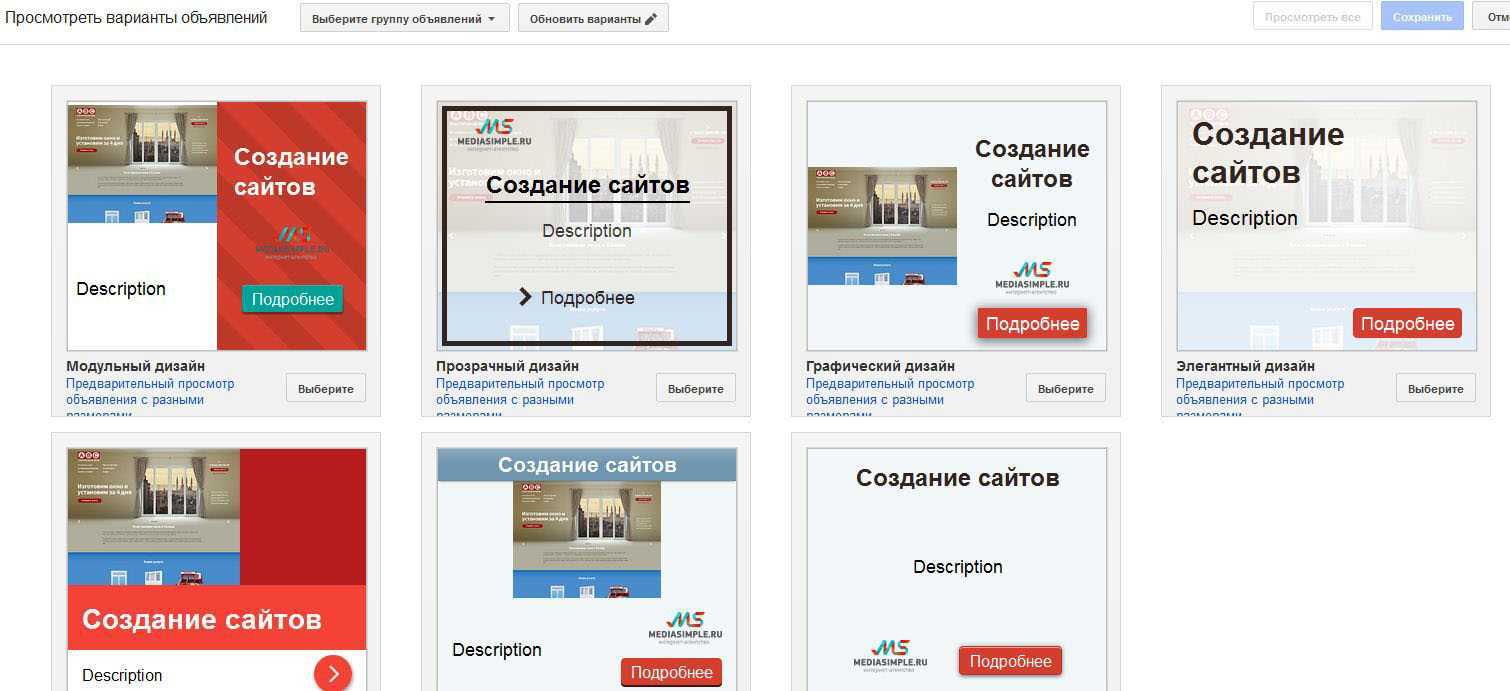 Посмотреть объявление во всех доступных форматах можно во вкладке «Веб-сайты и приложения», а, кликнув на «Сервисы Google», увидеть объявления для YouTube и Gmail. Внизу формы также есть возможность добавить призыв к действию в объявление.