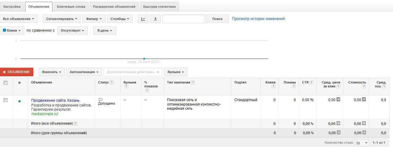 У меня в примере создано одно объявление, хотя, на самом деле, мне нужно под эти ключевые слова как минимум два. Отдельно под «разработку» и отдельно под «продвижение», так как это разные услуги, для которых нужны разные объявления и группы ключевых слов.