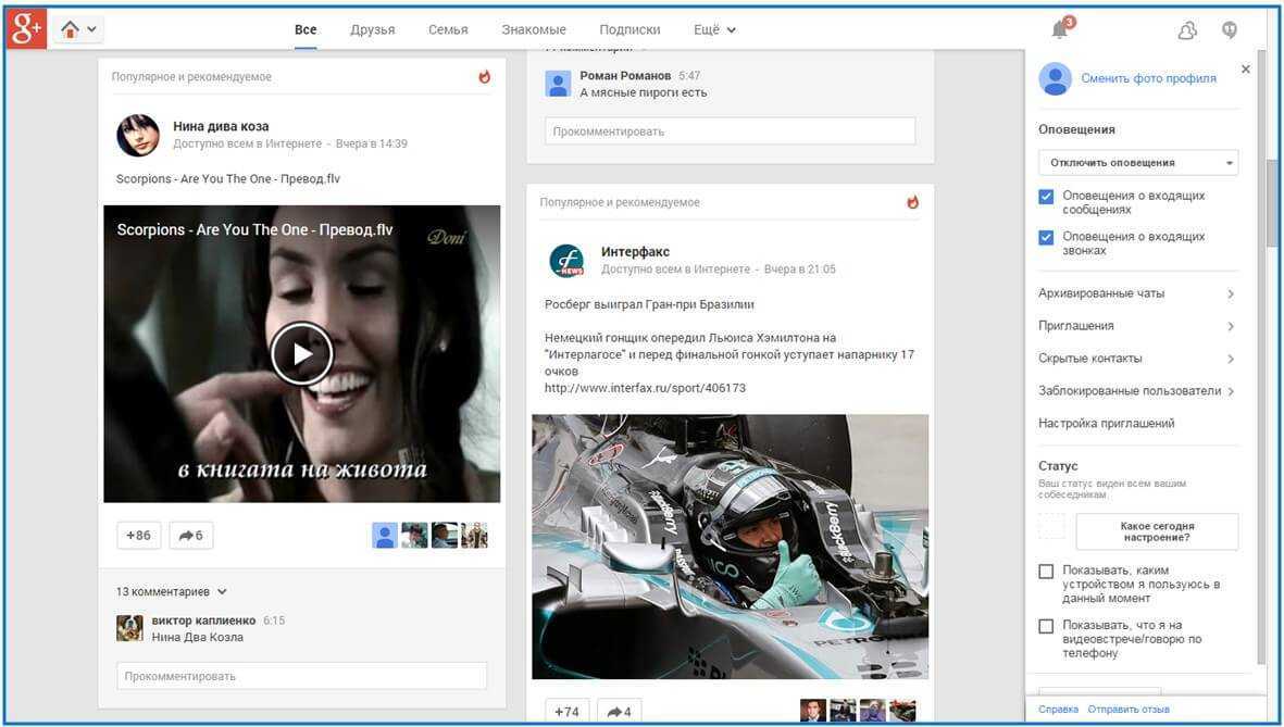 За происходящими событиями в мире сервис «Google+» позволяет наблюдать в разделе «Лента». Ваши друзья могут делиться заинтересовавшей их информацией и оставлять отзывы. Возможен вариант подписки на новостные ресурсы в зависимости от ваших интересов и круга общения. Такой принцип используется в Twitter-е и зарекомендовал себя как наиболее функциональный и эффективный способ получения информации.