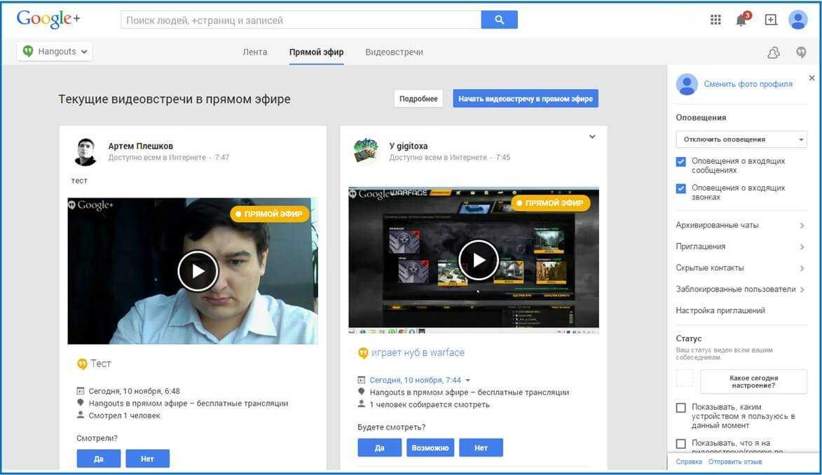 В разделе Hangouts предоставляется возможность обмена своими фотографиями, короткими сообщениями и проводить видеовстречи со всеми, у которых есть аккаунт Google. В случае же отсутствия аккаунта у вашего друга, ему будет отправлено сообщение по электронной почте с приглашением о проведении видеовстречи. За лучшими видеотрансляциями можно наблюдать в прямом эфире и оставлять свои комментарии. Предусмотрена возможность общения с несколькими пользователями.