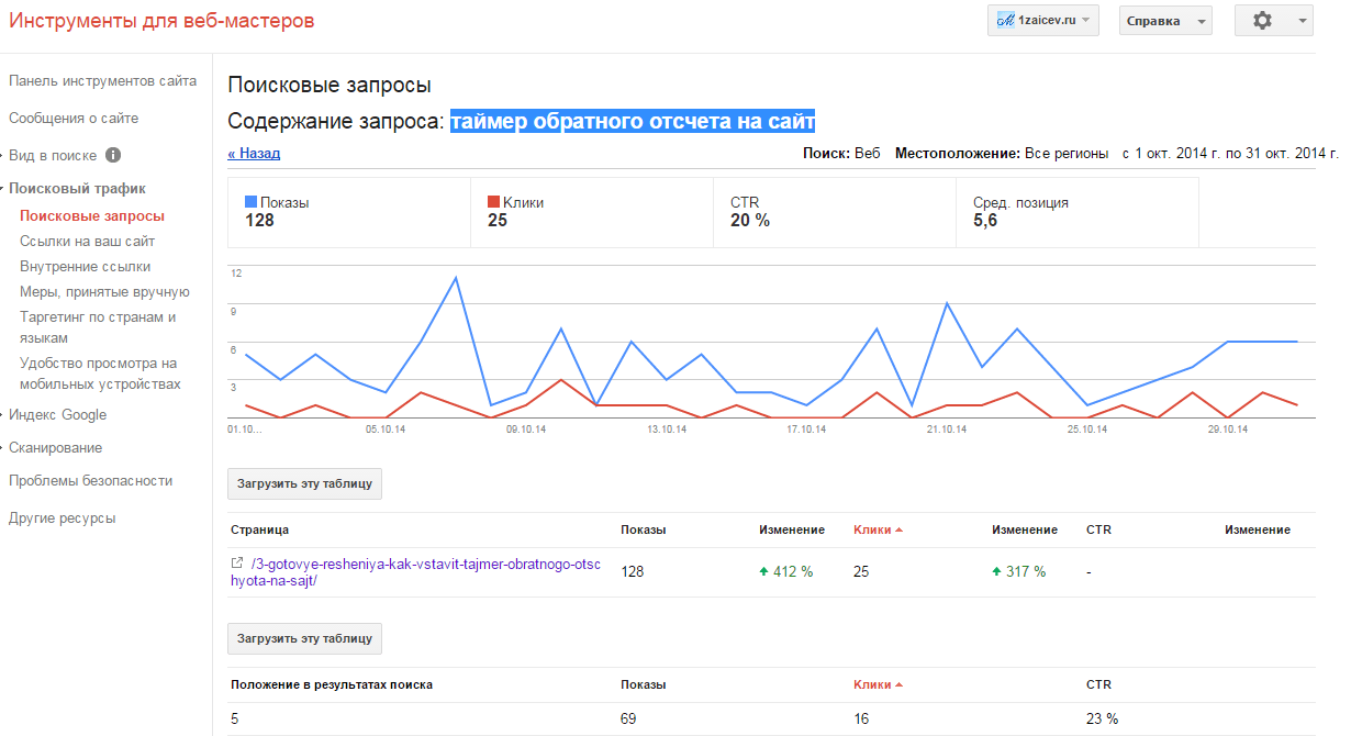 В этом разделе представлены ключевые слова, по которым Google нашёл материалы вашего сайта. По каждому ключевому слову можно посмотреть отдельно страницы вашего сайта, где содержатся ключевые слова.