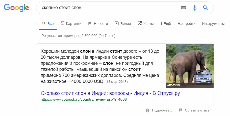 На поисковые запросы вопросительного характера Google часто выдает первой строчкой особым образом оформленный сниппет: с длинным описанием, часто с иллюстрацией. И такое описание выводится выше основных результатов поиска.
