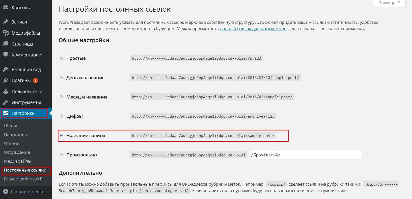 В административной части сайта переходим в меню «Настройки» — «Постоянные ссылки» — а дальше нужно выбрать пункт «Название записи» и сохранить изменения.