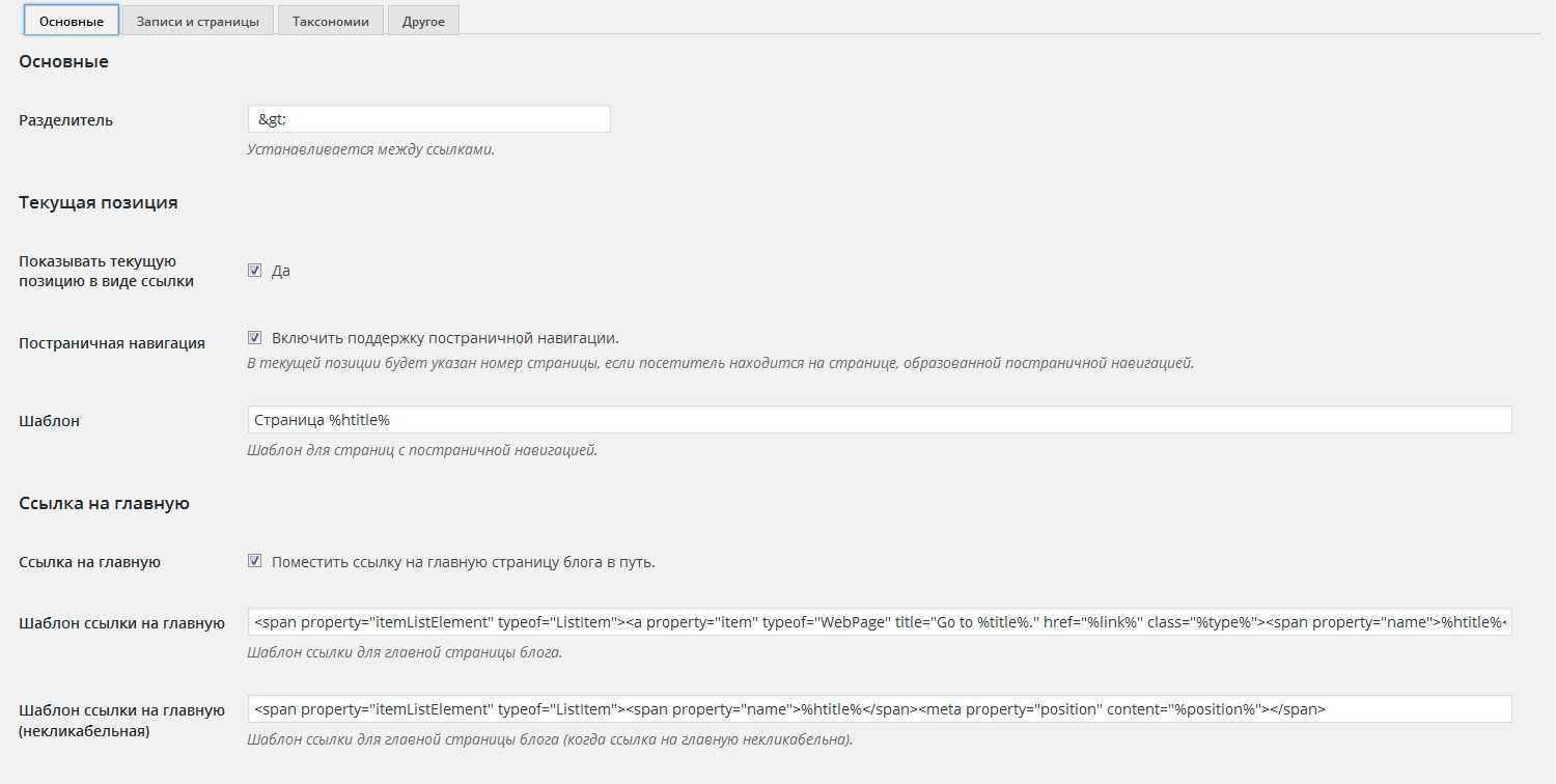 Плагин имеет различные настройки, которые в большинстве случаев вам не понадобятся, так как из действительно полезных там разве что возможность выбирать будет ли в пути к странице отображаться главная страница сайта, а также возможность выбрать разделитель между пунктами нашей «хлебной цепочки».