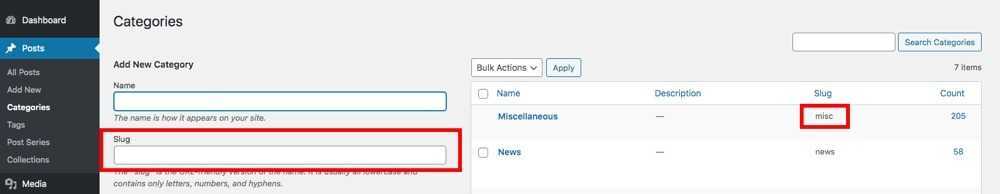 По умолчанию категории будут использовать введенное вами «название» в качестве слага, или же можно ввести пользовательский слаг. В примере, приведенном выше, можно увидеть, что мы сократили слаг категории «Miscellaneous» до “misc”. Но обычно названия категорий бывают короткими и конкретными, и вам не нужно будет (или не захочется) их менять.