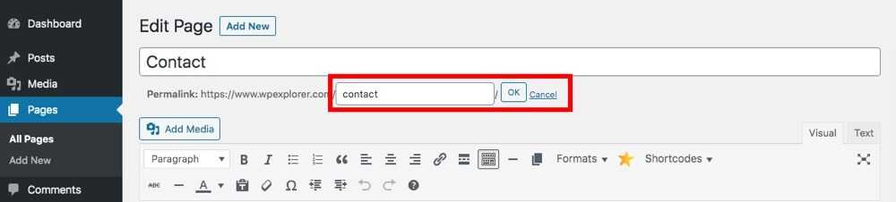 Как и в случае с записями, при создании новой страницы или редактировании уже существующей вы сможете найти поле слага прямо под заголовком. WordPress автоматически добавит в качестве слага полный заголовок страницы.