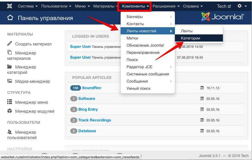 2) В верхнем меню выбираем Компоненты, далее «Ленты новостей» и «Категории»: