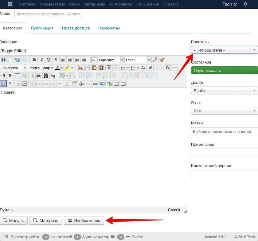 5) При необходимости можно задать родительскую категорию и добавить изображения к описанию: