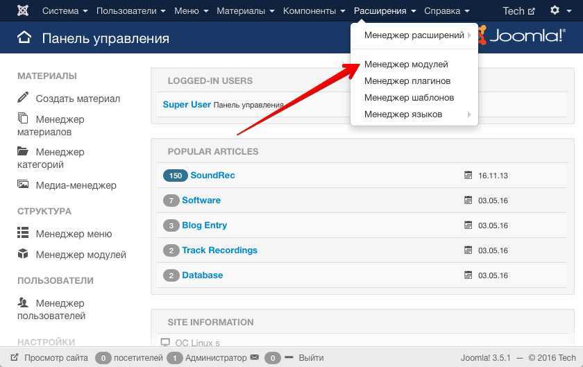2) В верхнем меню выбираем Расширения, затем Менеджер Модулей: