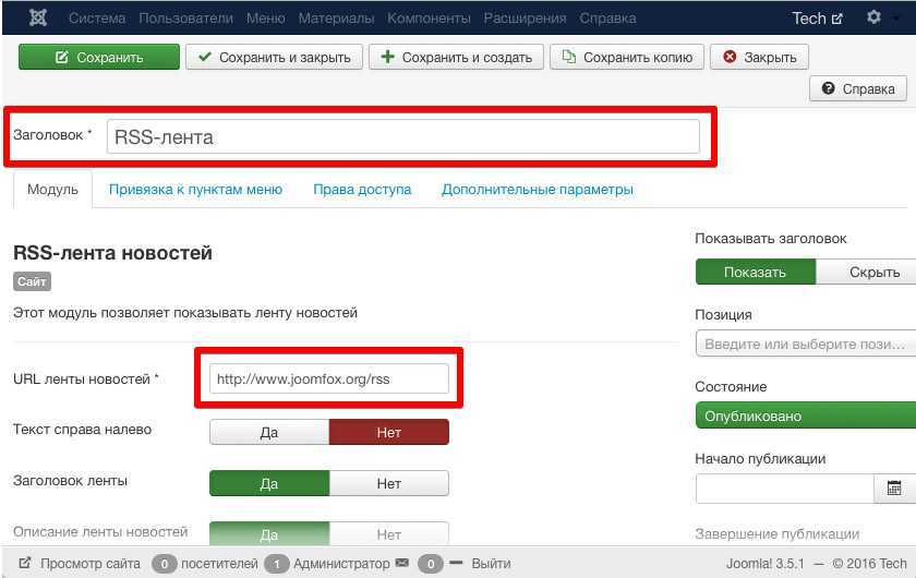 4) Во вкладке «Модуль» задаем имя Заголовка и «URL ленты новостей»: