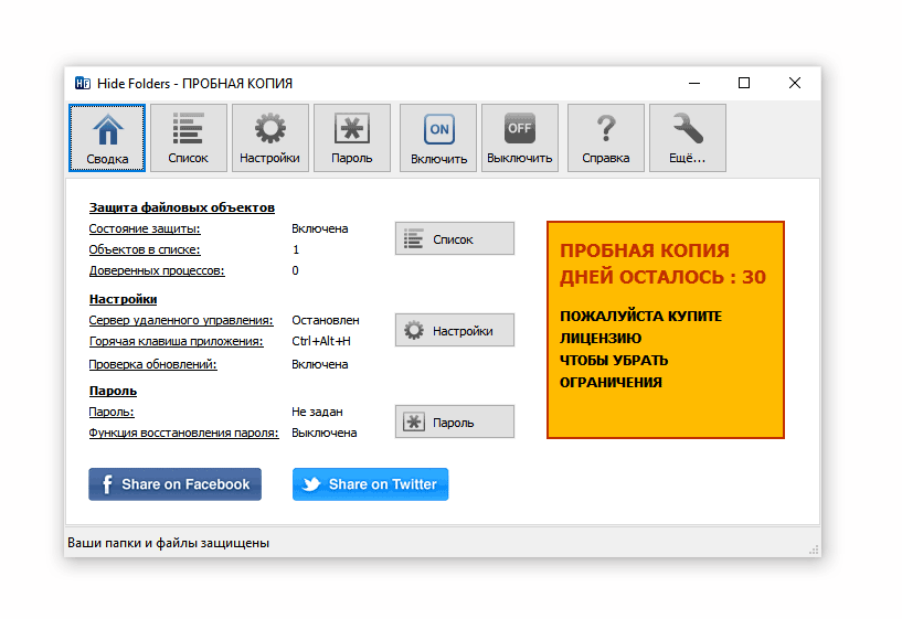 - Hide Folder. Удобная программа, имеющая интерфейс на русском языке. С её помощью можно установить пароль на папку, внешний диск или флешку, скрыть каталог, осуществлять удалённое управление и экспортировать список защищаемых файлов. Стоимость — 8 баксов за один компьютер.