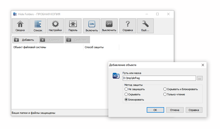 Интерфейс программы с большего переведен на русский язык (в том числе справка и советы). Работать с Hide Folders просто и удобно, благо все требуемые кнопки вынесены на панель инструментов. Вы просто составляете список объектов и затем выбираете метод защиты. При необходимости, любой элемент легко удалить из данного списка.