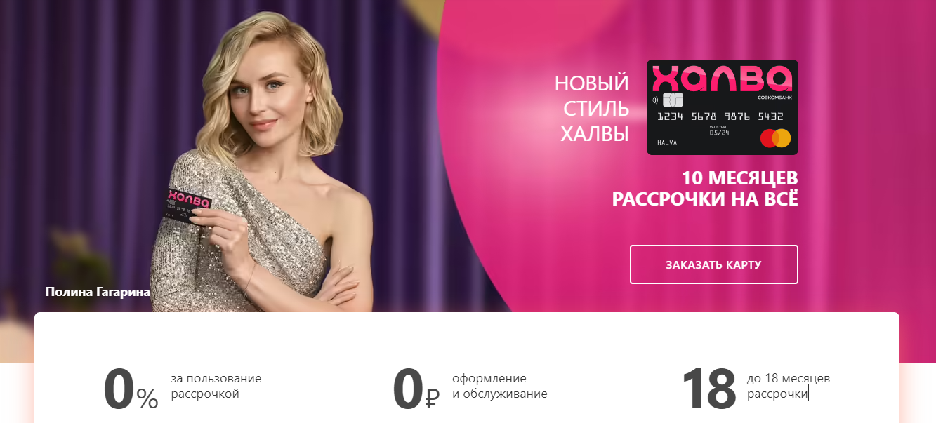 Рассмотрим элементы лендинга на примере карты рассрочки «Халва», о которой мы уже говорили выше.