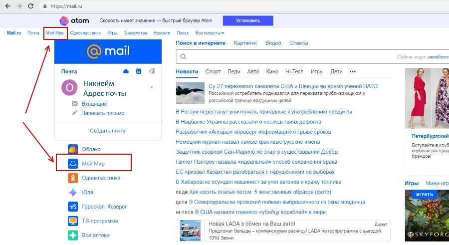 Теперь для перехода в Мой Мир нужно кликнуть на аналогичную запись вверху экрана.