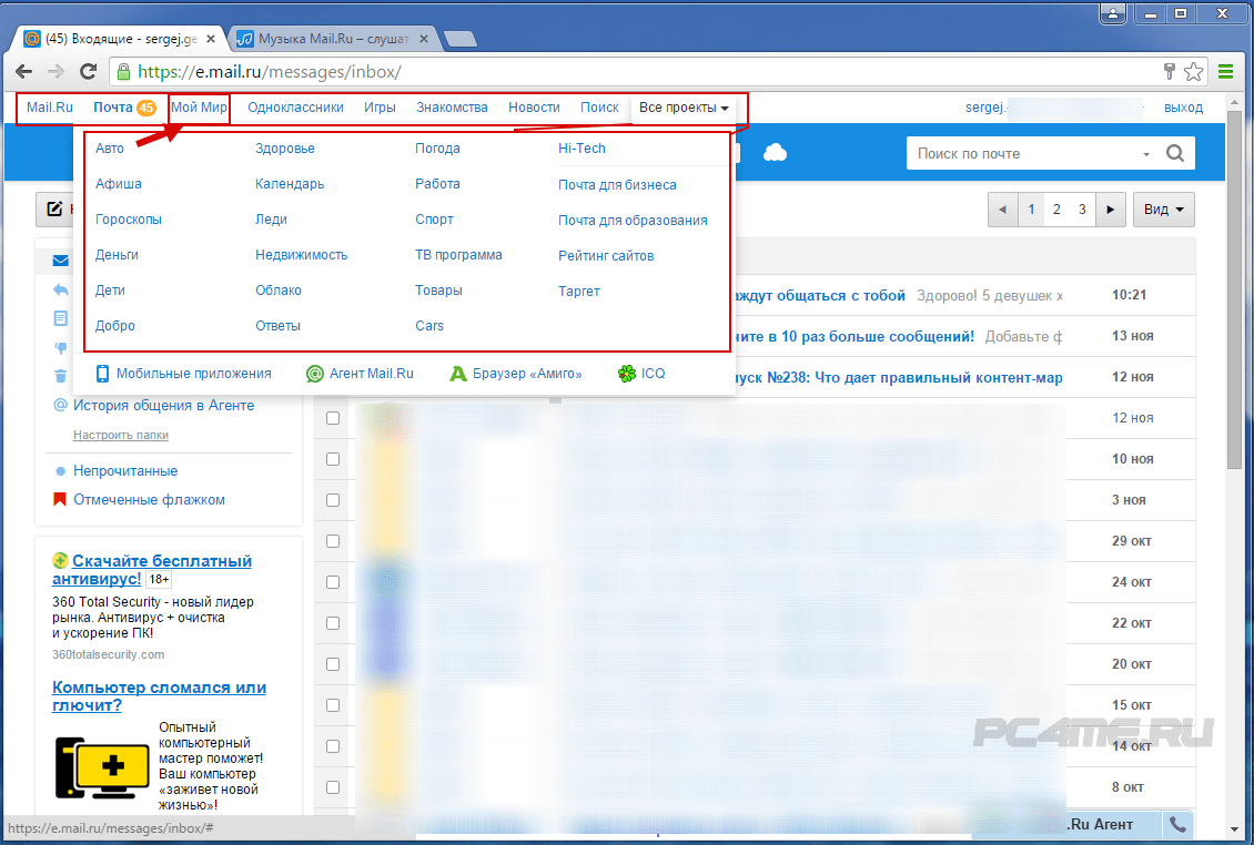 - Майл.ру (папку входящие вы найдете , а создать новый Имейл-адрес можно будет ) — старейший в рунете бесплатный почтовый сервис. Буквально несколько лет назад его серьезно переделали и теперь он вполне отвечает всем описанным выше критериям (простота, функциональность, безопасность и борьба со спамом). Однако, есть нюансы, поэтому советую ознакомиться с мануалом . Безвозмездно вам предоставляют в пользование аж целых 25 Гбайт.