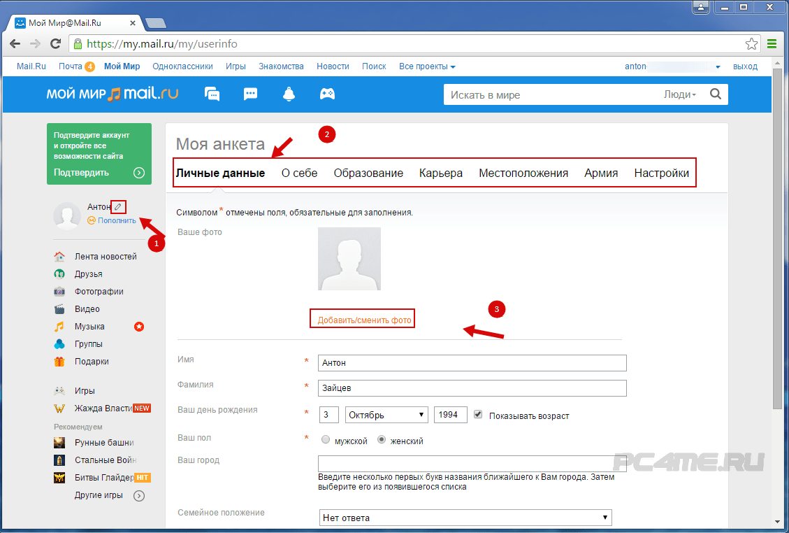 , для отображения на моей страннице, а также изменить другую персональную информацию о себе.