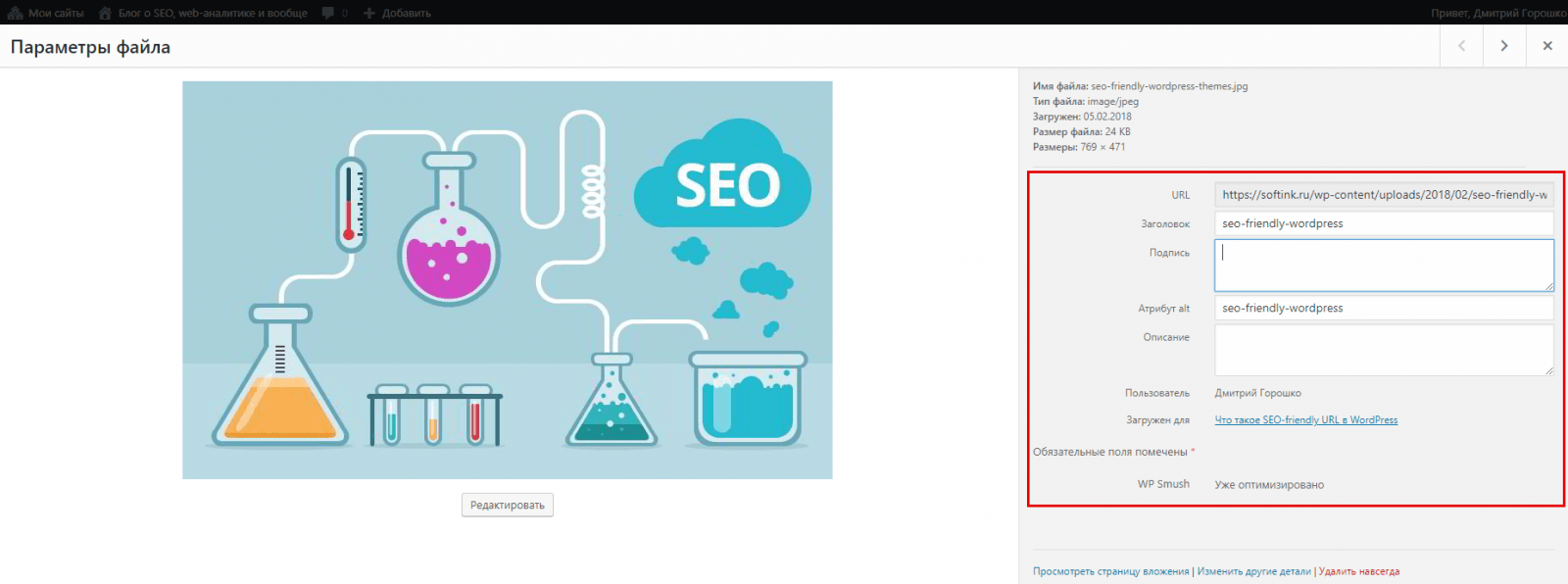 Другой важный момент в оптимизации изображений для поисковых систем- использование Заголовков (Title) и тегов ALT. Эти теги помогают поисковым системам понять, о чем идет речь. WordPress позволяет легко добавлять заголовки и теги alt при загрузке изображения.
