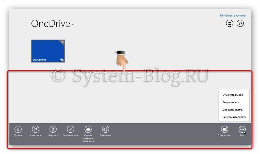 Если нажать правой кнопкой мышки на файл или папку в приложении «OneDrive», то внизу появится меню для работы с файлами. Тут можно сделать копирование, перемещение, переименование, удаление, создание папки и добавление файла с компьютера, и прочие операции с файлами.
