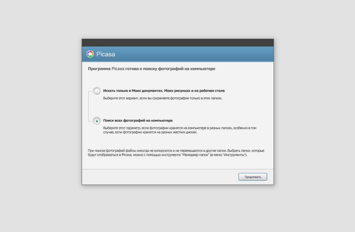 Советую натравить Picasa на весь компьютер — через минуту уточним программе, что именно сохранить в своей базе данных, а что исключить из неё.
