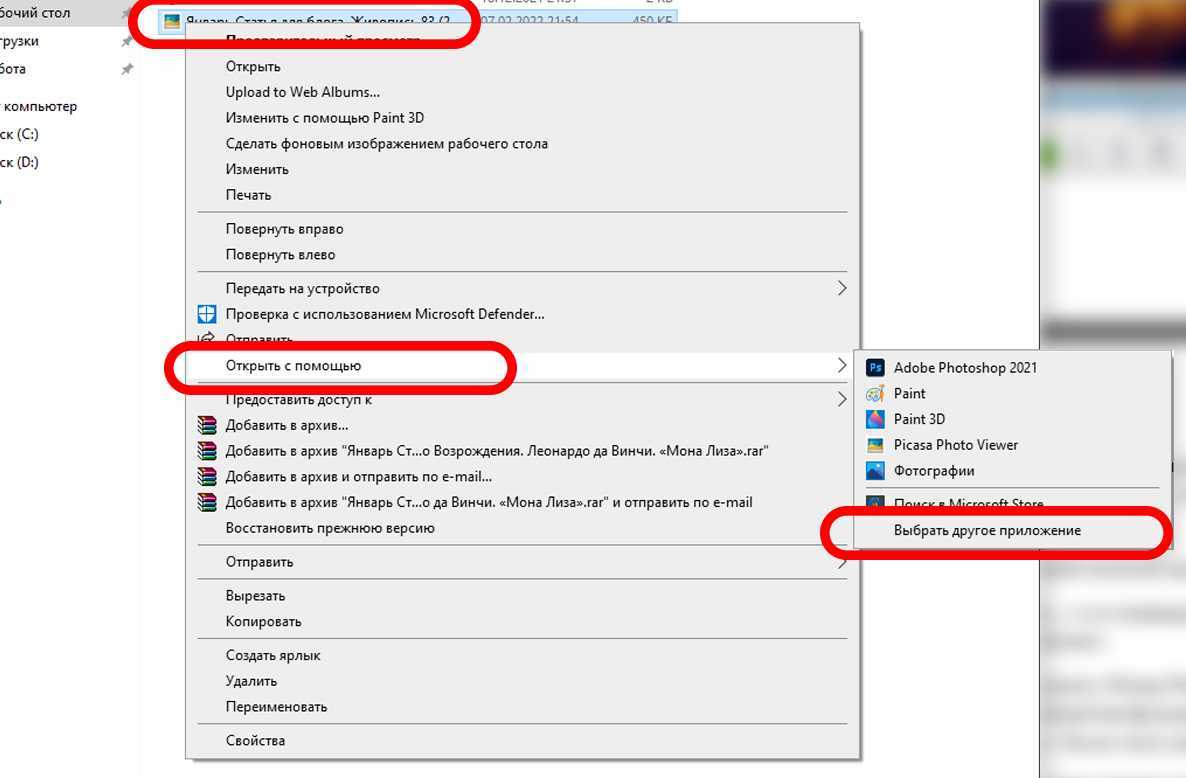 - Завести курсор на «Открыть с помощью…» и в появившемся диалоговом окне указать нижний пункт «Выбрать другое приложение».
