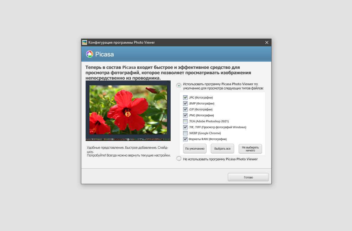 Для быстрого просмотра изображений внутри встроенного проводника Windows следует для начала задать приложение Configure Picasa Photo Viewer как способ открытия файлов по умолчанию. Для этого нужно выполнить такую инструкцию: