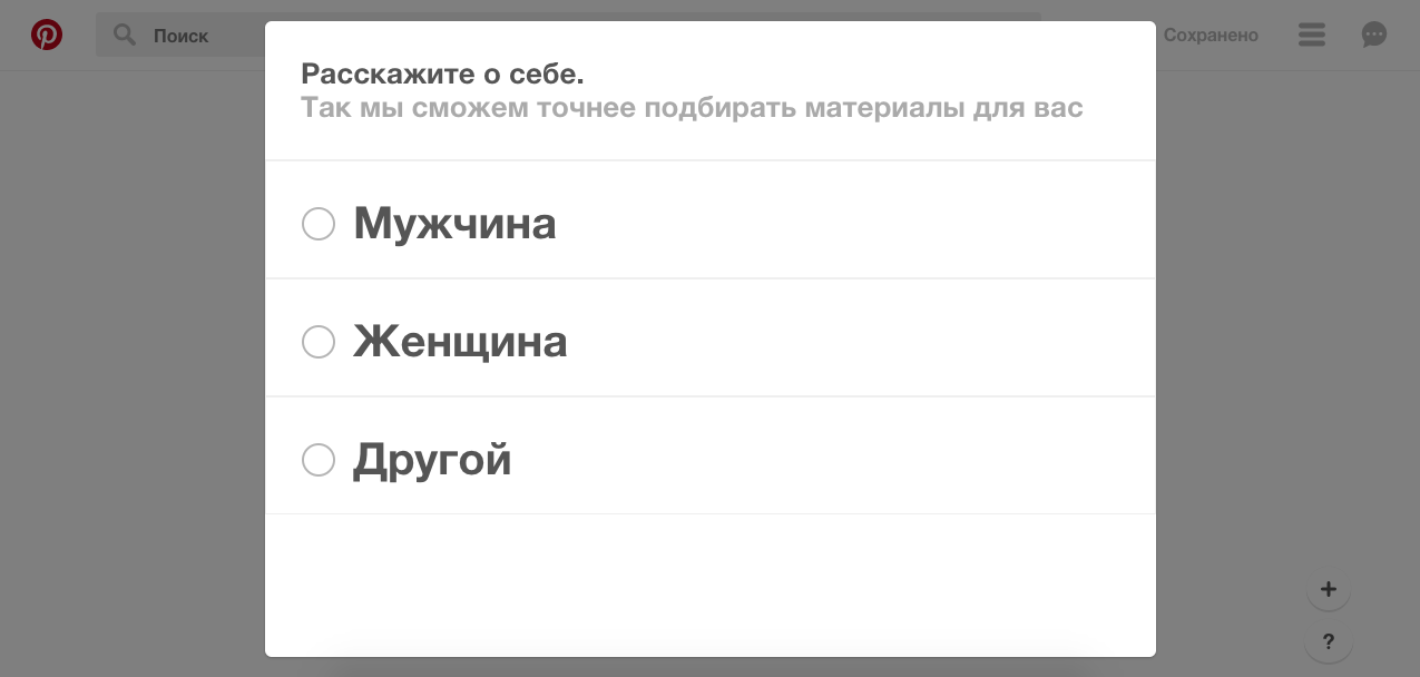 Регистрация в Pinterest возможна через Facebook, Google+ и почту. Мне удобнее через Facebook – это занимает одну секунду. Далее сервис предлагает пару вопросов, чтобы сформировать ленту рекомендаций.