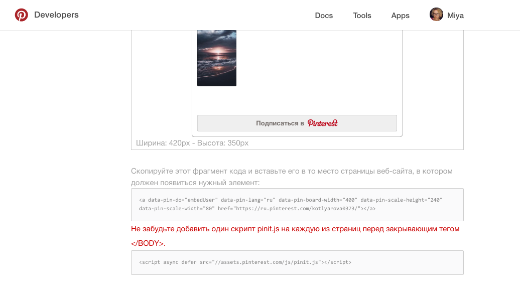 Еще в Пинтересте можно сделать виджет со своими досками для размещения в своем блоге или на сайте и привлечения оттуда подписчиков. Можно добавить только кнопку, отдельный пин, отдельную доску или весь профиль: