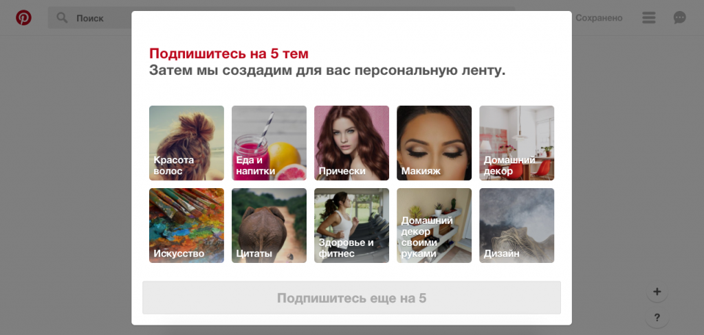 Как только Вы начнете регистрацию, Вам будет предложено «с ходу» выбрать 5 интересных коллекций, после чего Вы попадете в соцсеть. Возможно, что на почту Вам будут периодически присылать самые интересные пины из тех коллекций, которые Вы выбирали как интересные.