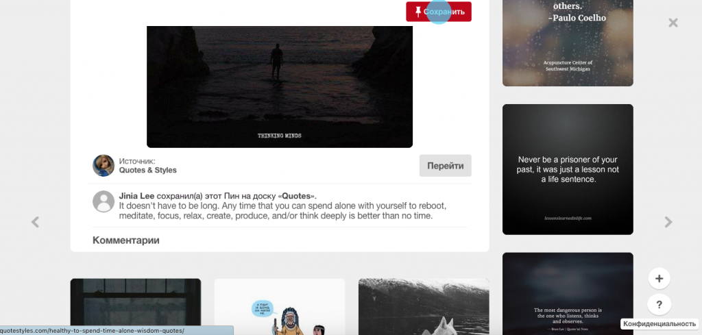 После всех этих манипуляций вы попадаете в ленту рекомендаций. Любой Пин из нее вы можете сохранить в свой профиль, чтобы не потерять: