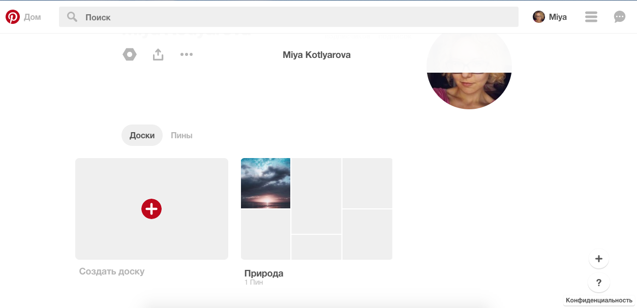 Затем переходим на сайт Pinterest, жмем “Сохранено” или на свое имя (в зависимости от способа регистрации там будет одна из этих двух надписей) и видим все свои доски. Кстати, их можно делать приватными – тогда их будете видеть только вы, и публичными – открытыми для всех.