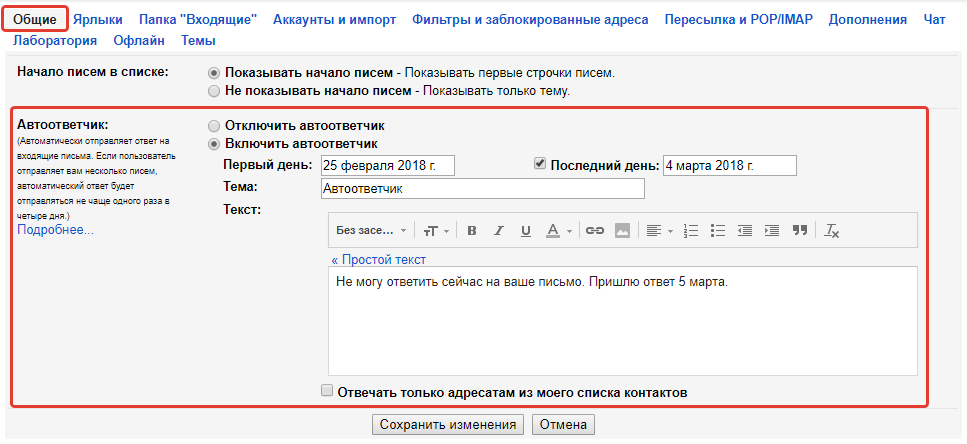 В общих настройках можно изменить пароль и включить автоответчик на входящие письма. Проще говоря, если вы подключите данную функцию, отправители писем на вашу почту смогут получать уведомления об их доставке автоматически. И здесь можно обыграть данную возможность и включить в текст письма информацию, которую бы вы хотели донести до адресанта.