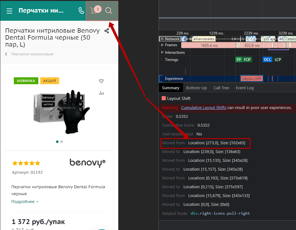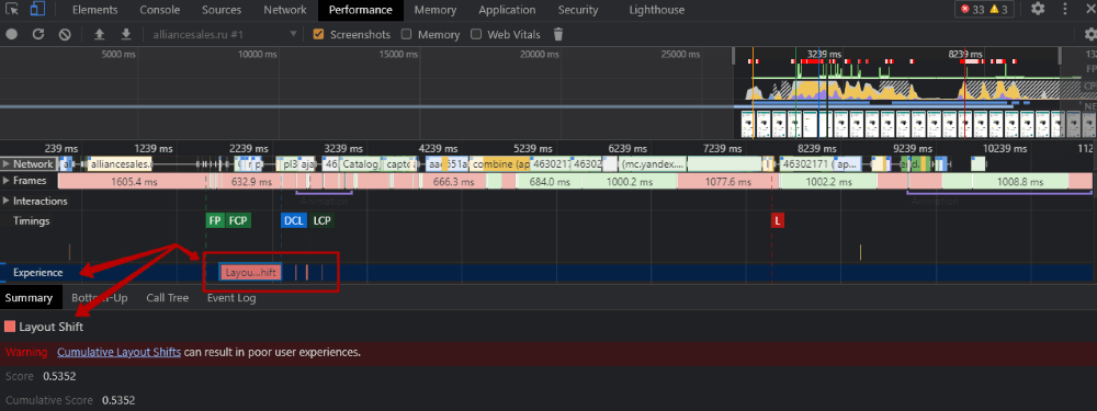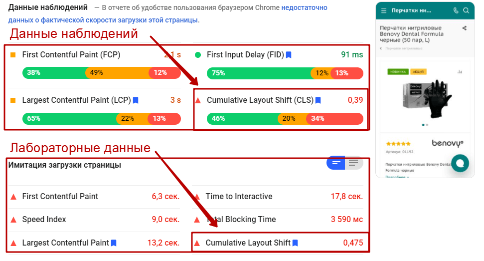Лабораторные данные показывают CLS 0,475, то есть происходит сдвиг макета на величину, которая не входит в рекомендуемые показатели.
