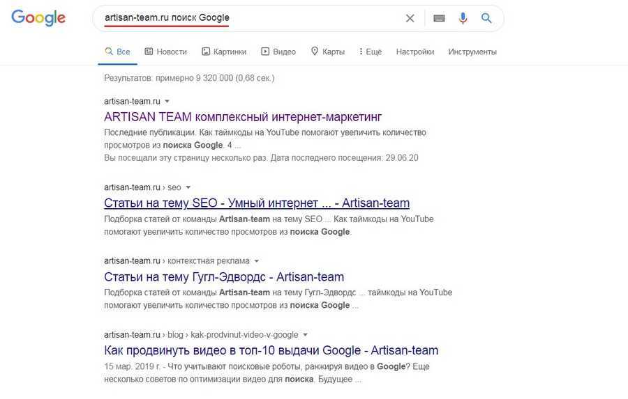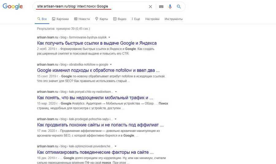 Ограничиваем директорию поиска только блогом (site:artisan-team.ru/blog/) и через intext: задаем ключевые слова для поиска.