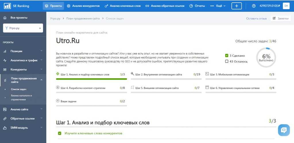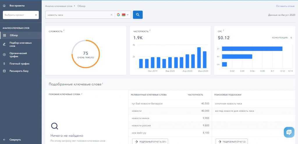 Это поможет при проверке рейтинга оценки позиций сайта по определенному запросу в поиске. Еще один хороший инструмент, помогающий оценить семантическое ядро для продвижения. Опять же, в SE Ranking имеется соответствующая вкладка. Заходите туда, анализируйте ваши ключи по сложности продвижения, частотности, CPC, релевантности. Приложение автоматически выведет подсказки, которые тоже приносят трафик, если их включить в статьи.