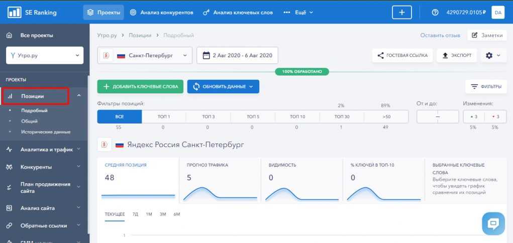 Например, вот как можно узнать место и позицию сайта по определенному запросу поисковике в SE Ranking: