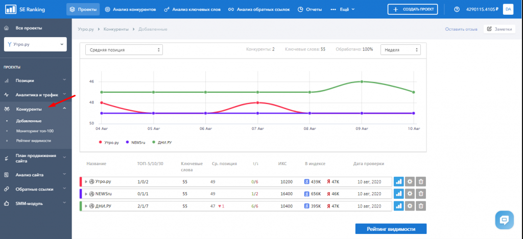 - Выявлять позиции конкурентов и отслеживать их, используя запросы, по которым вы продвигаете свой сайт;