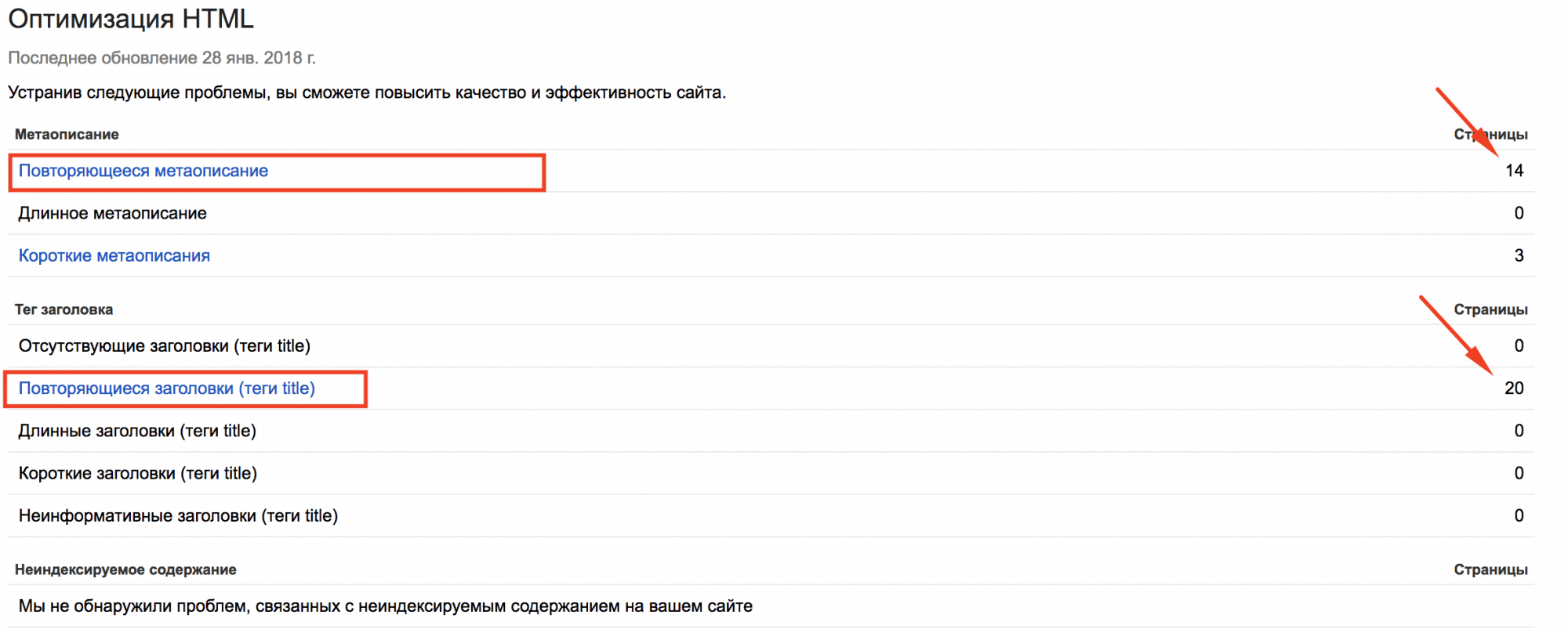 Заходим в Google Search Console, выбираем свой сайт, в левом меню кликаем «Вид в поиске» – «Оптимизация HTML» и смотрим такие пункты, которые связаны с термином «Повторяющееся»: