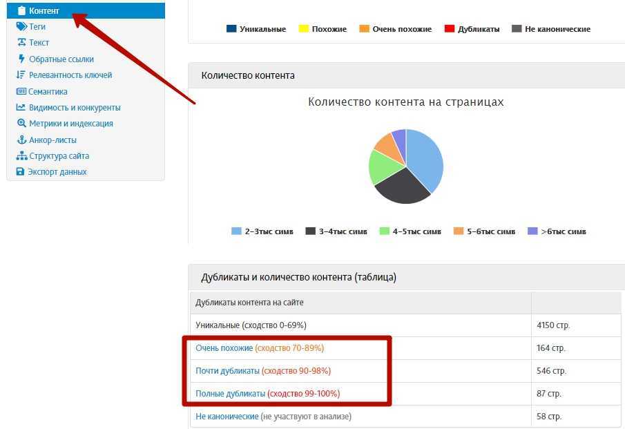 Вкратце скажу, что дубли страниц можно найти во вкладке «Контент», спускаемся вниз и здесь вот есть «Полные дубликаты», «Почти дубликаты» и «Очень похожие».