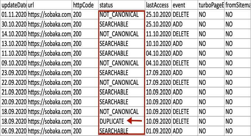 - Выгружаем архив – смотрим на статус страниц. Если обнаружен дубль, тогда вы увидите DUPLICATE.
